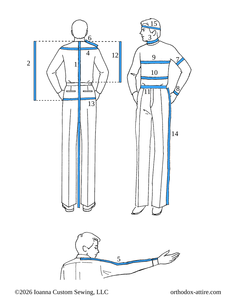 1. Cassock Length: Measure from the base of the back of your neck to where you would like the bottom of the cassock hem to fall.